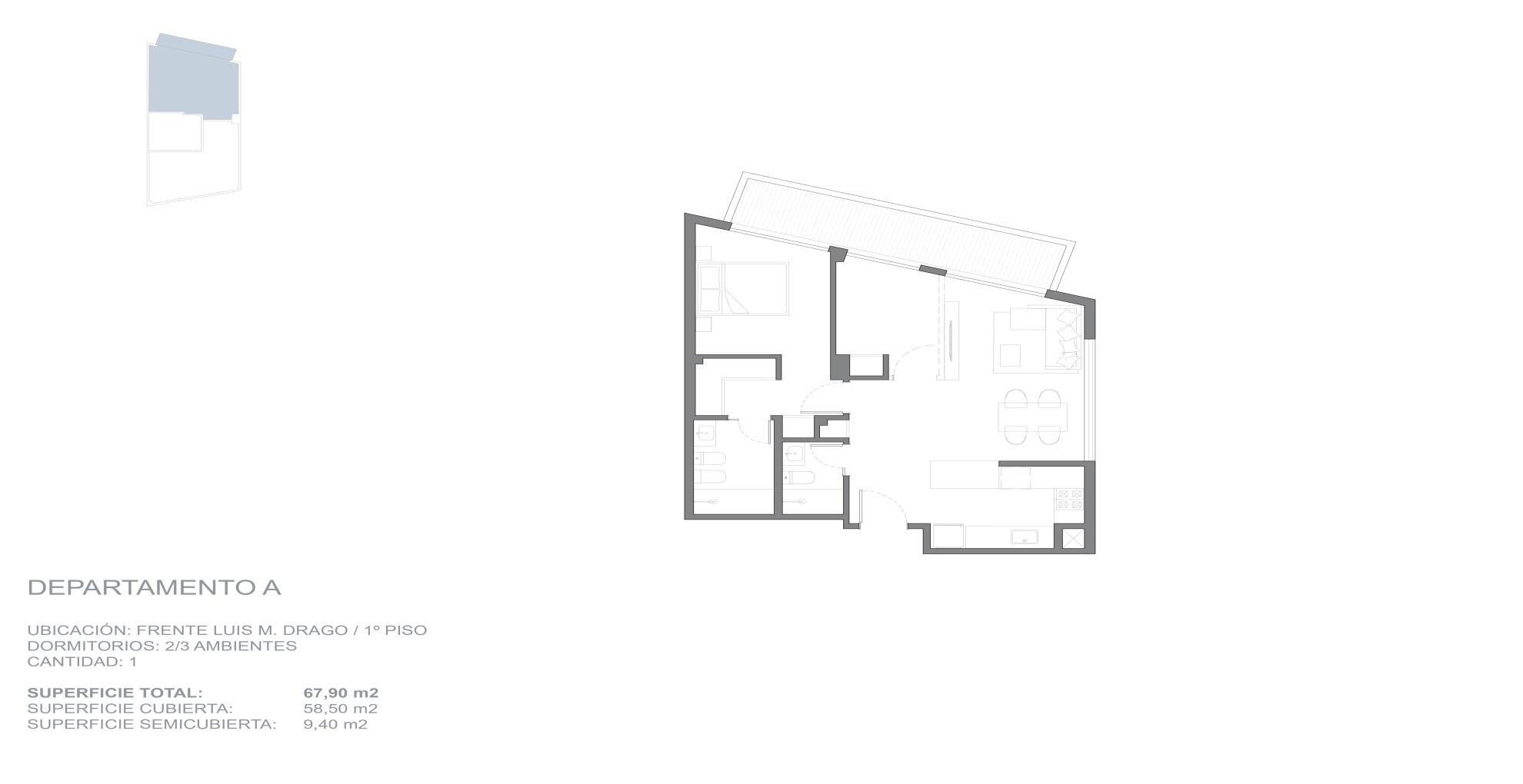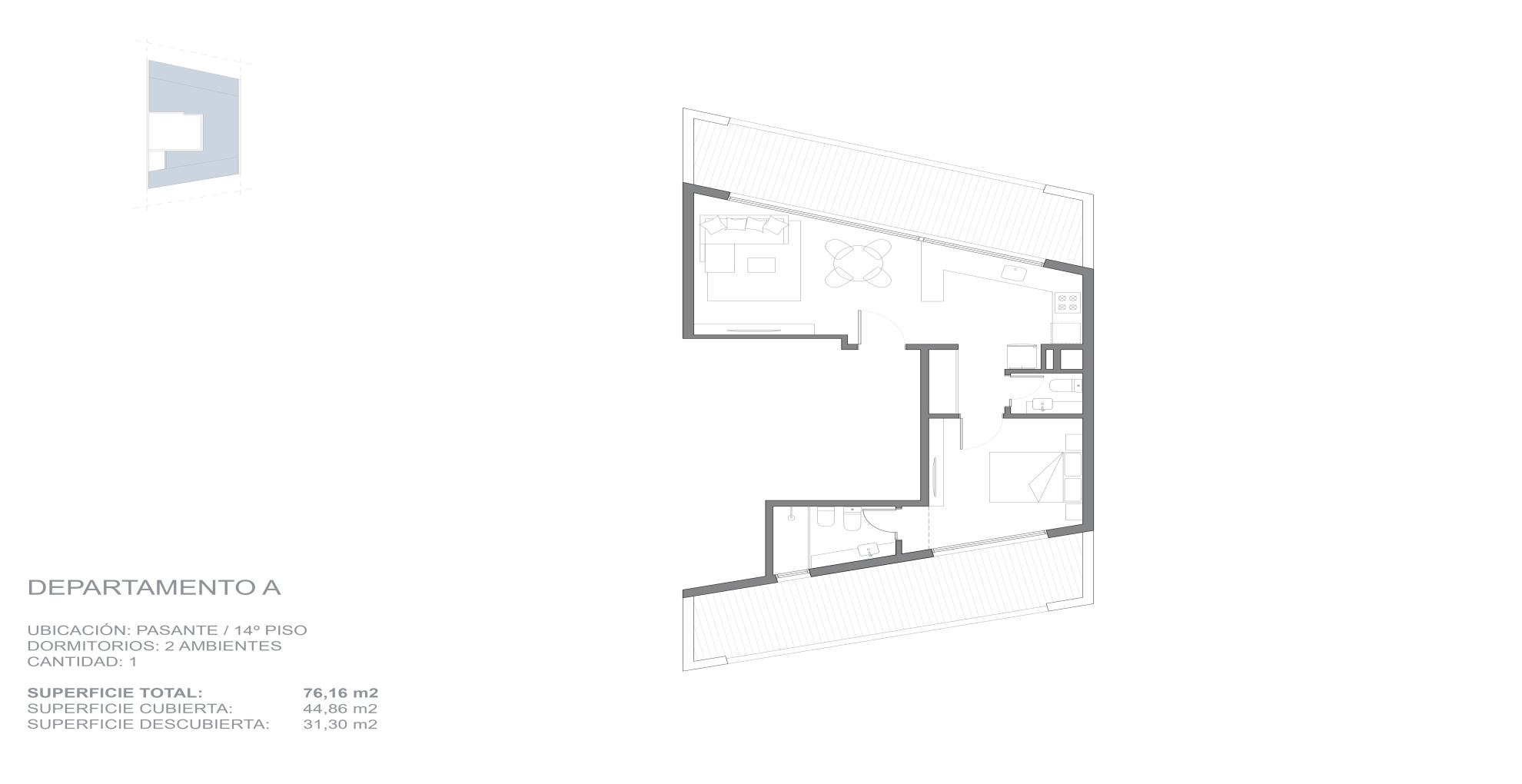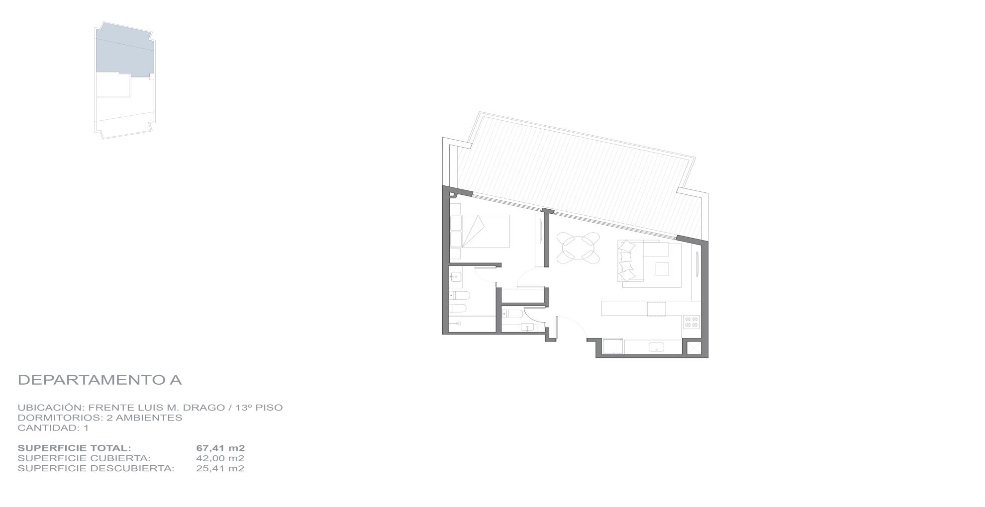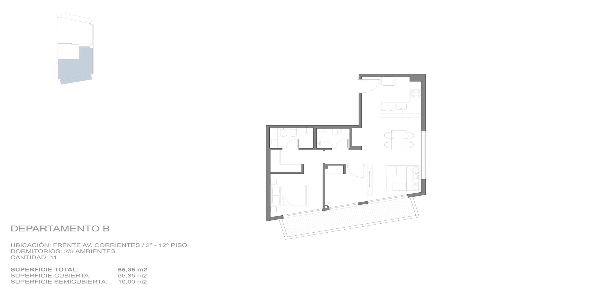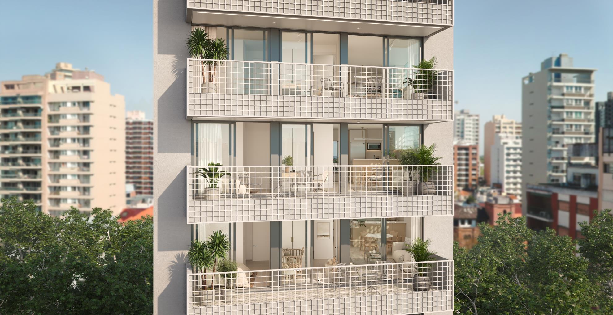 Edificio que da a dos calles y se desarrolla en 14 pisos, con un local en planta baja y unidades de 2 y 3 ambientes, todas con balcón y vistas abiertas hacia Av.